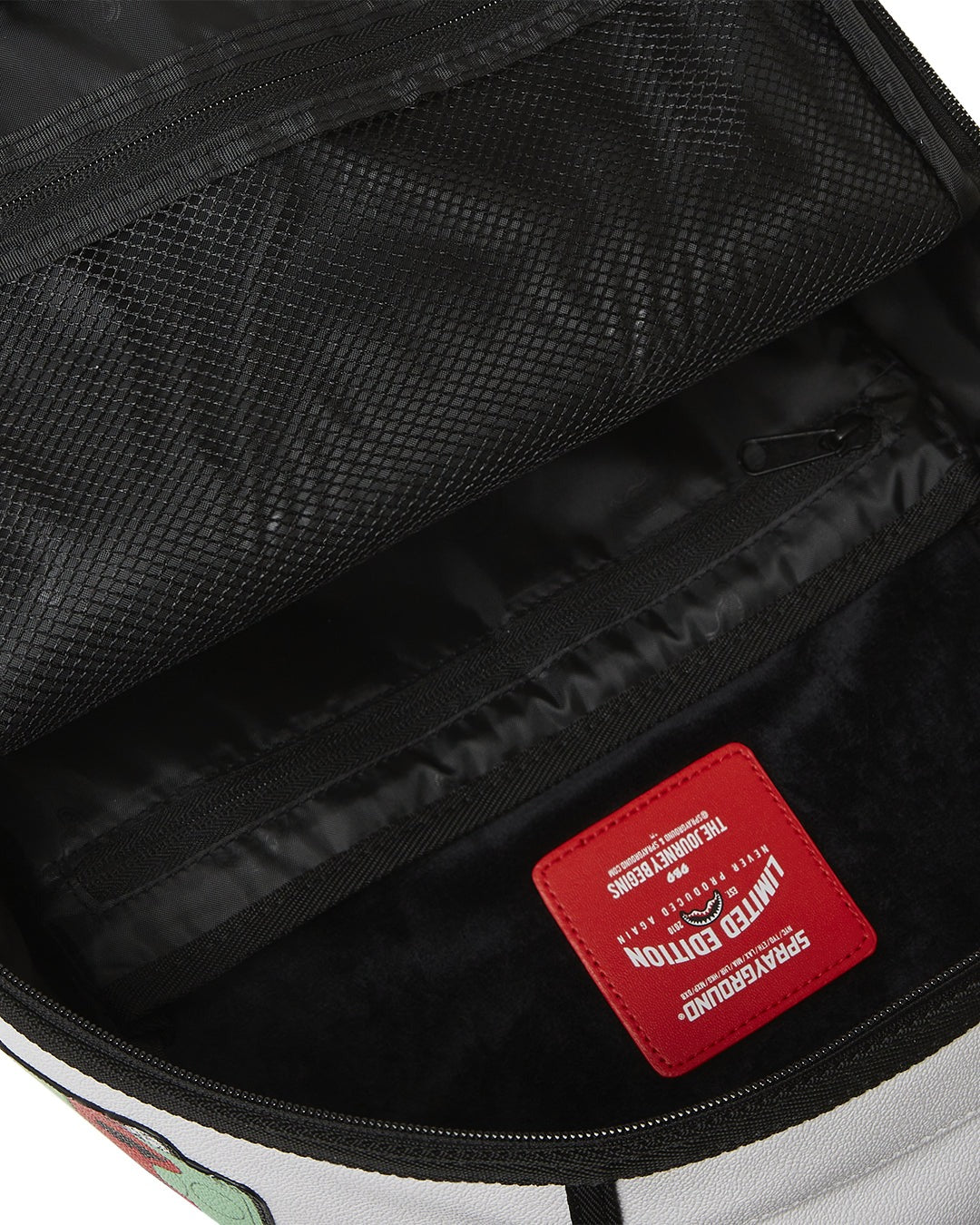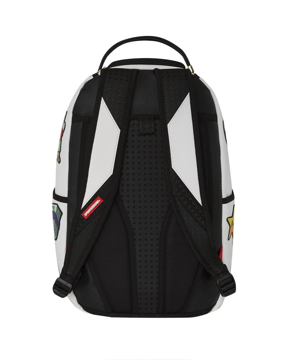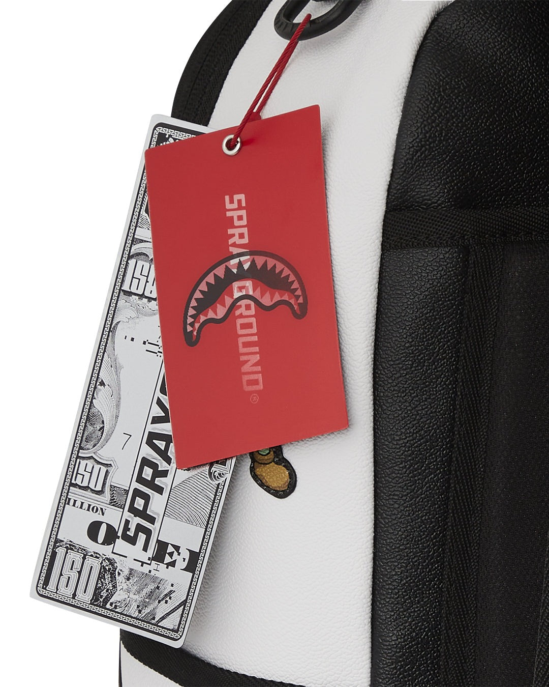 Dimensions: 18" x 6" x 11.5" • Front zipper pocket • Side pockets • Zippered Stash pocket • Separate velour sunglass compartment • Ergonomic mesh back padding • Adjustable Straps for custom sizing • Gold zippers with metal hardware • Metal "Sprayground Authentic" badge • Slide through back sleeve connects to carry-on luggage to free your hands