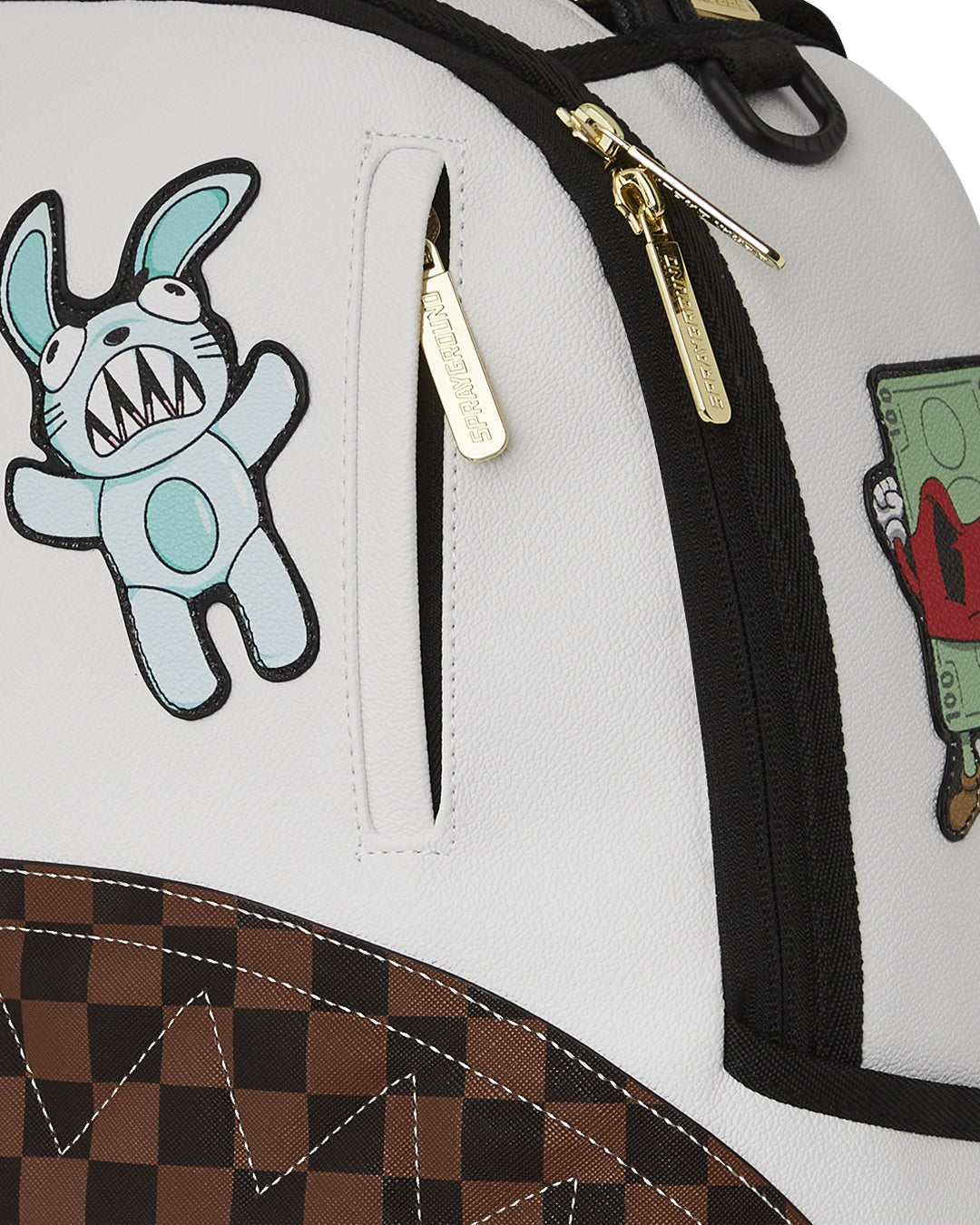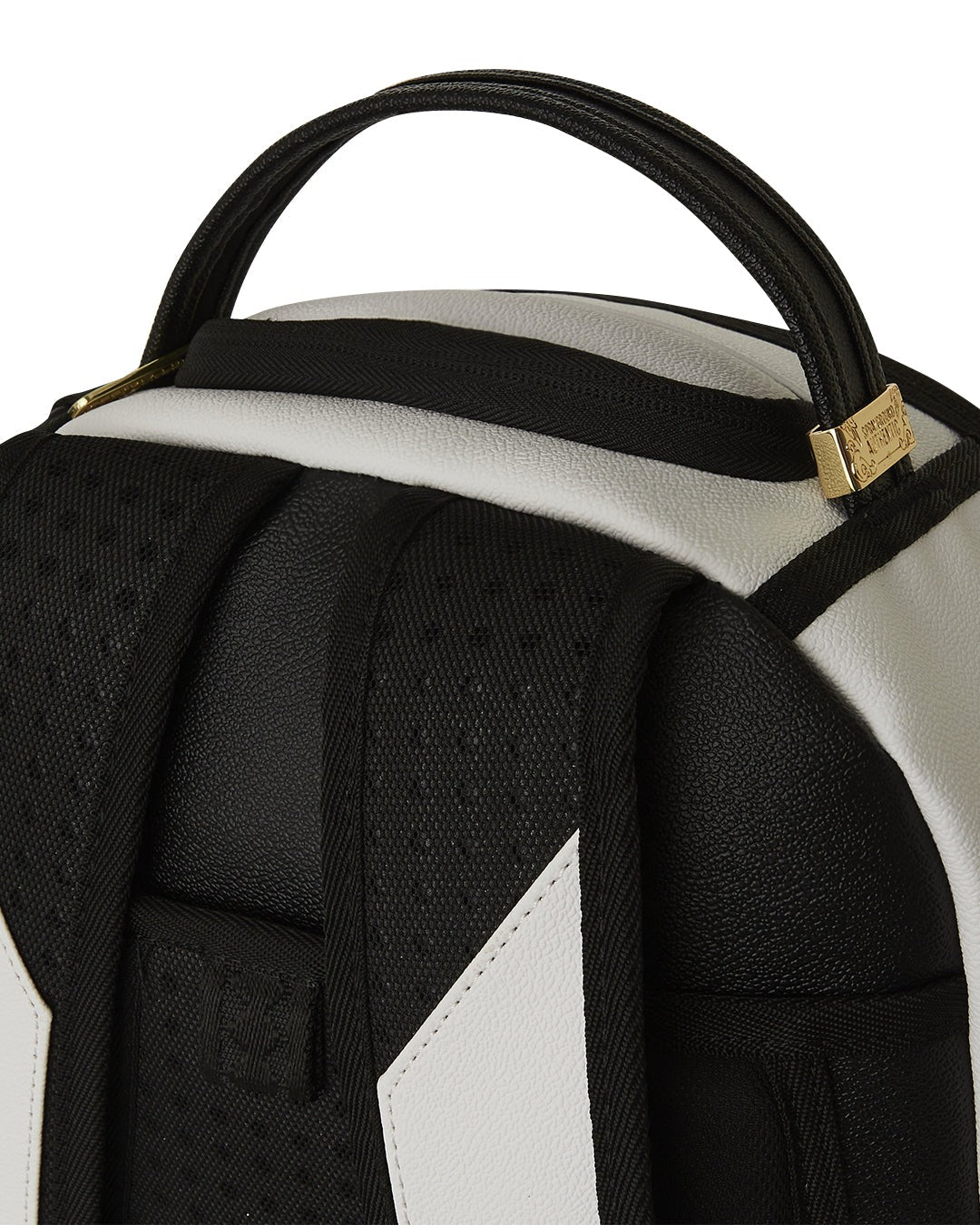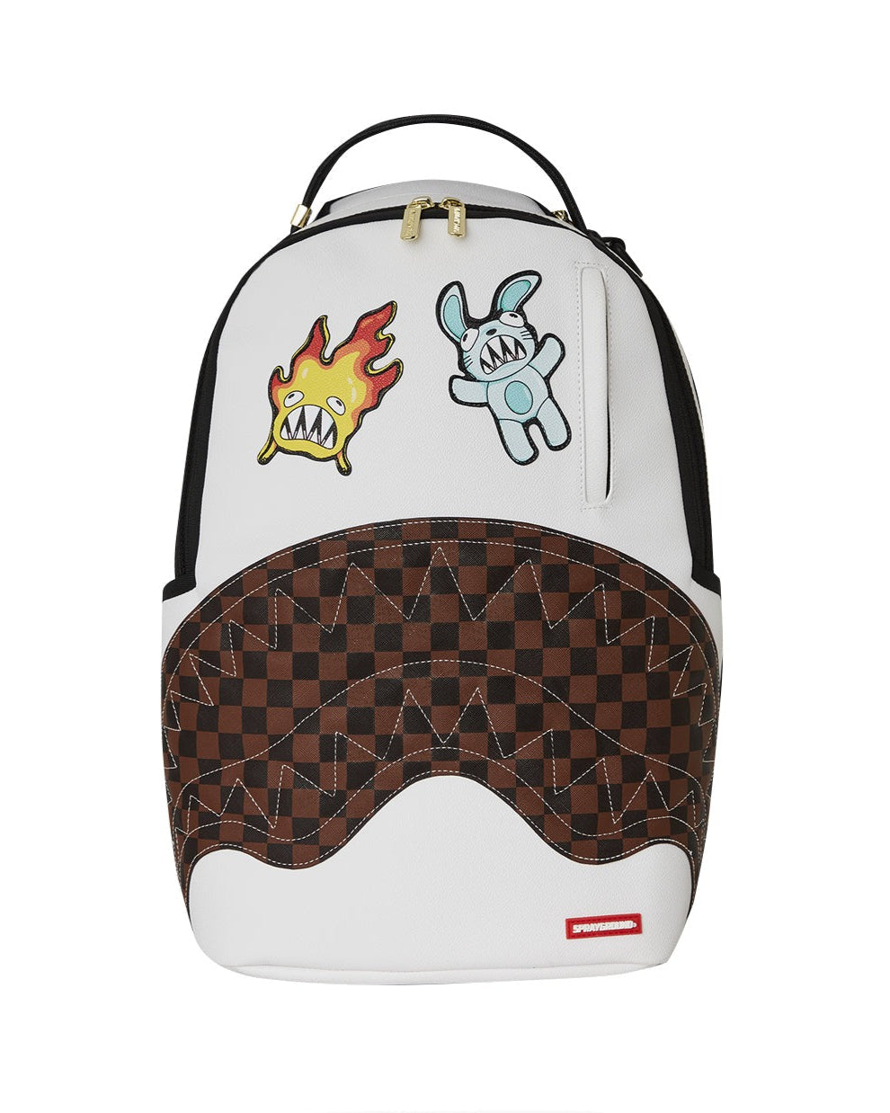 Dimensions: 18" x 6" x 11.5" • Front zipper pocket • Side pockets • Zippered Stash pocket • Separate velour sunglass compartment • Ergonomic mesh back padding • Adjustable Straps for custom sizing • Gold zippers with metal hardware • Metal "Sprayground Authentic" badge • Slide through back sleeve connects to carry-on luggage to free your hands