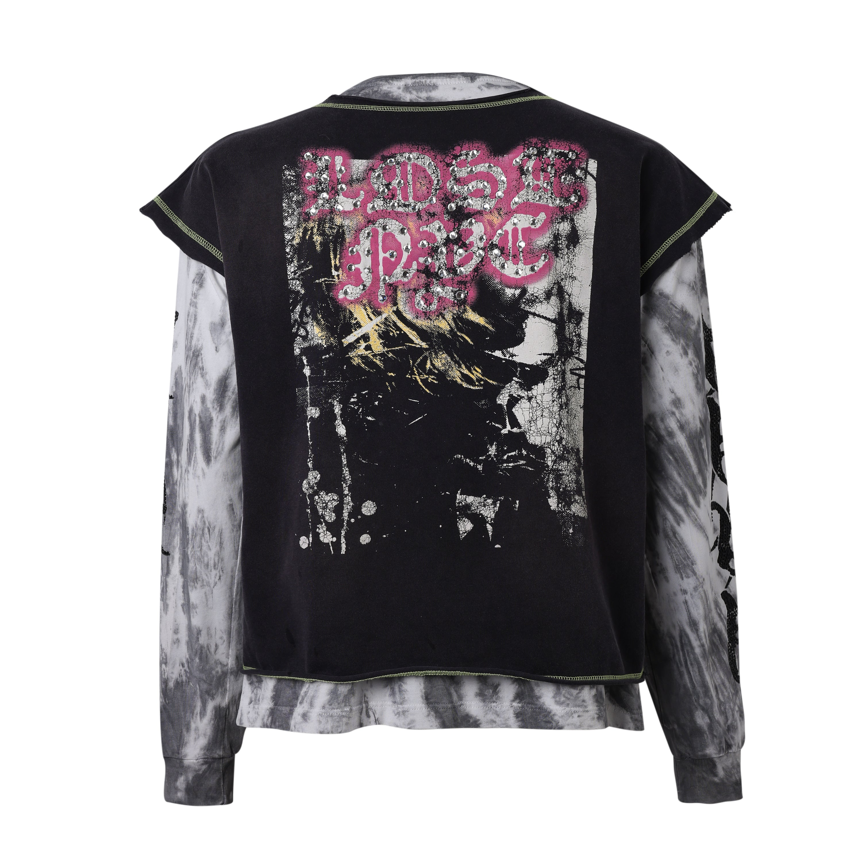 The LOST INTRICACY – Double Fantasy 2-In-1 Shirt features a two-piece layered design for versatile styling. Individually numbered out of 550, the outer tee is finished with a raw hem and neckline, a vintage screen-printed graphic, crystal-encrusted front and back, and contrast stitching. The inner long sleeve features custom tie-dye, crystal-encrusted printed sleeves, and distressed detailing for a worn-in, elevated street look.