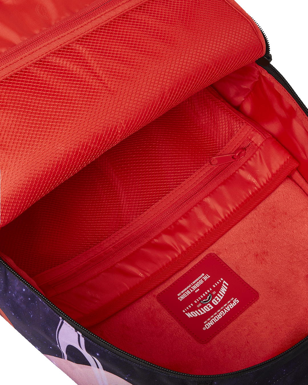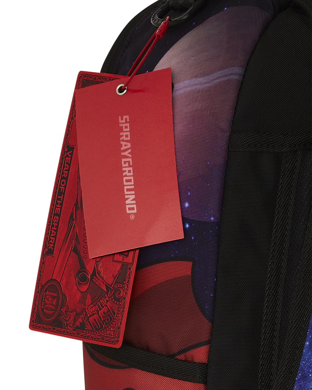 Dimensions: 18" x 6" x 11.5" • Front zipper pocket • Side pockets • Zippered Stash pocket • Separate velour sunglass compartment • Ergonomic mesh back padding • Adjustable Straps for custom sizing • Gold zippers with metal hardware • Metal "Sprayground Authentic" badge • Slide through back sleeve connects to carry-on luggage to free your hands